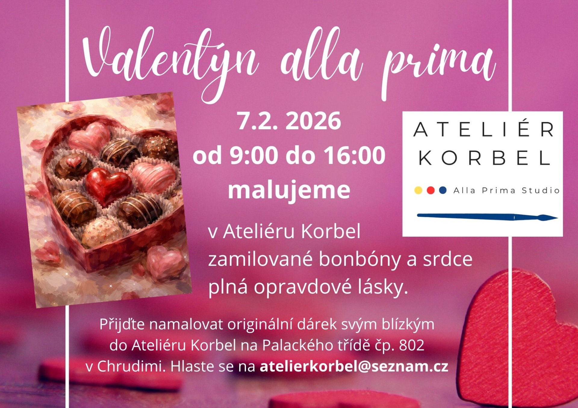 Valentýn alla prima v sobotu 7. února 2026. Přijďte si namalovat srdce z lásky do Ateliéru Korbel